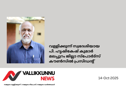 വള്ളിക്കുന്ന് സ്വദേശിയായ പി. ഹൃഷികേഷ് കുമാര് മലപ്പുറം ജില്ലാ സ്പോര്ട്സ് കൗണ്സില് പ്രസിഡന്റ് 14 October 2025