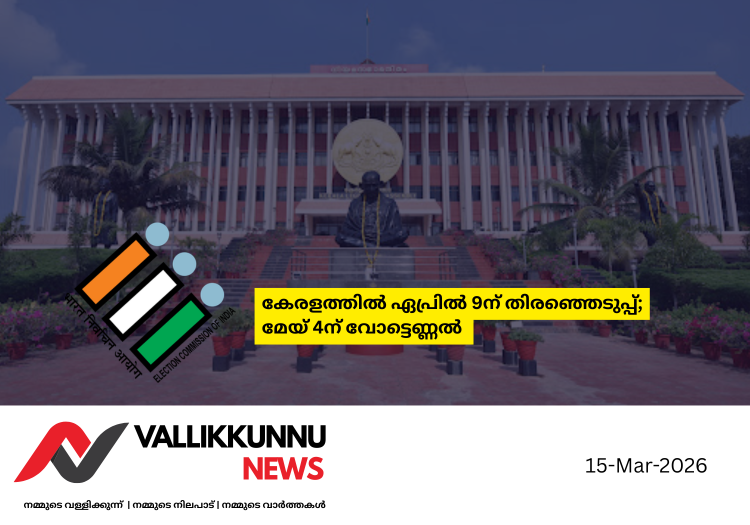 കേരളത്തിൽ ഏപ്രിൽ 9ന് തിരഞ്ഞെടുപ്പ്; മേയ് 4ന് വോട്ടെണ്ണൽ 16 March 2026